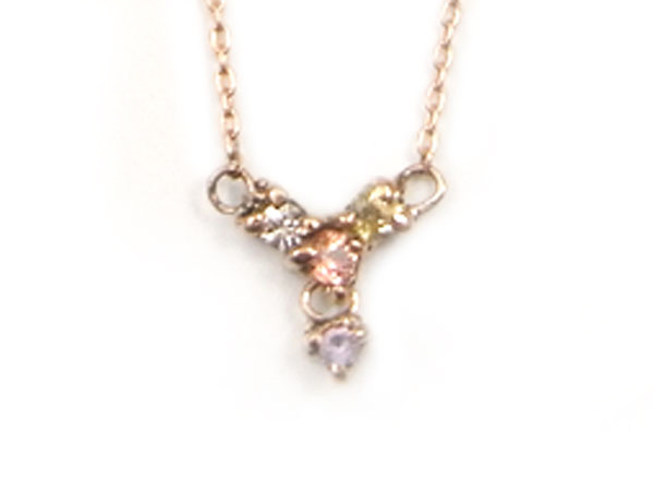 カラフルなカラーサファイアが零れ落ちそうなデザイン。指が細く長く見える効果が期待できるVシェイプ。先端の石は揺れるデザイン。9月の誕生石です。